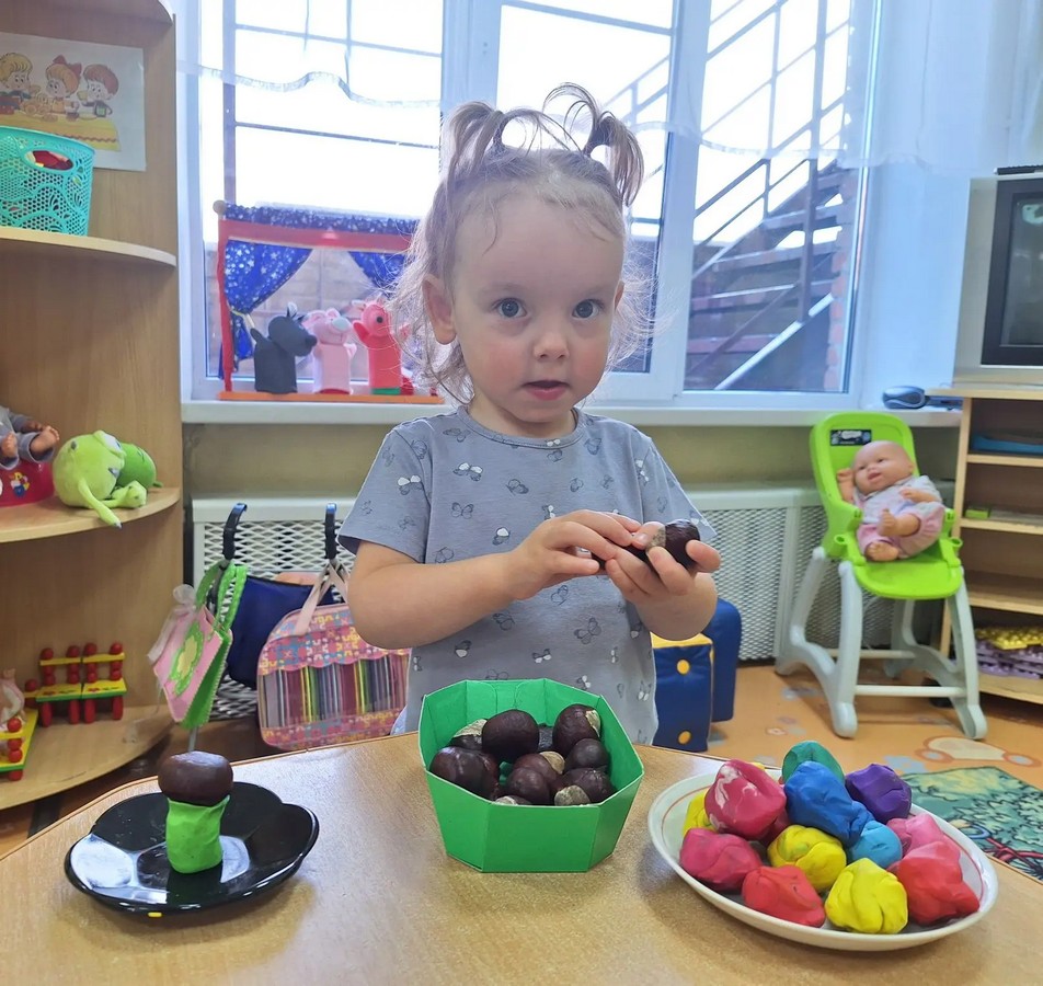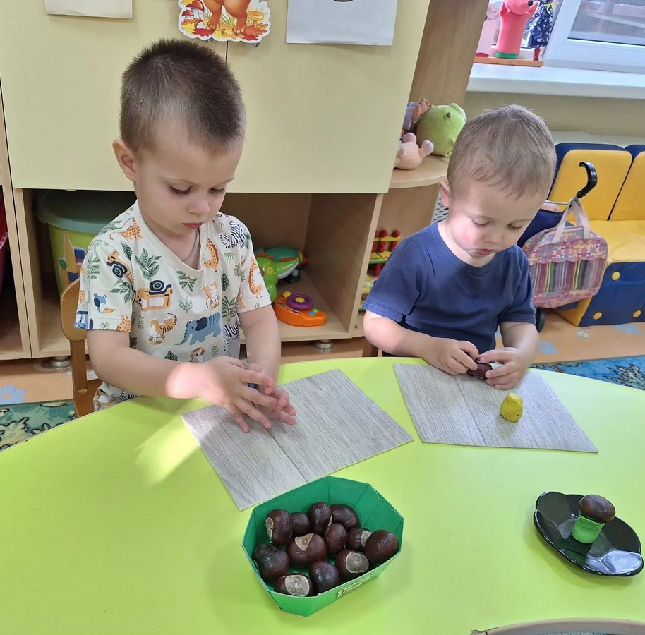 Ребята учились сочетать в поделке пластилин и природный материал, закрепляли умение раскатывать пластилин прямыми движениями ладоней,развивали внимание,речь и мелкую моторику пальцев.Воспитывать любознательность и бережное отношение к природе.