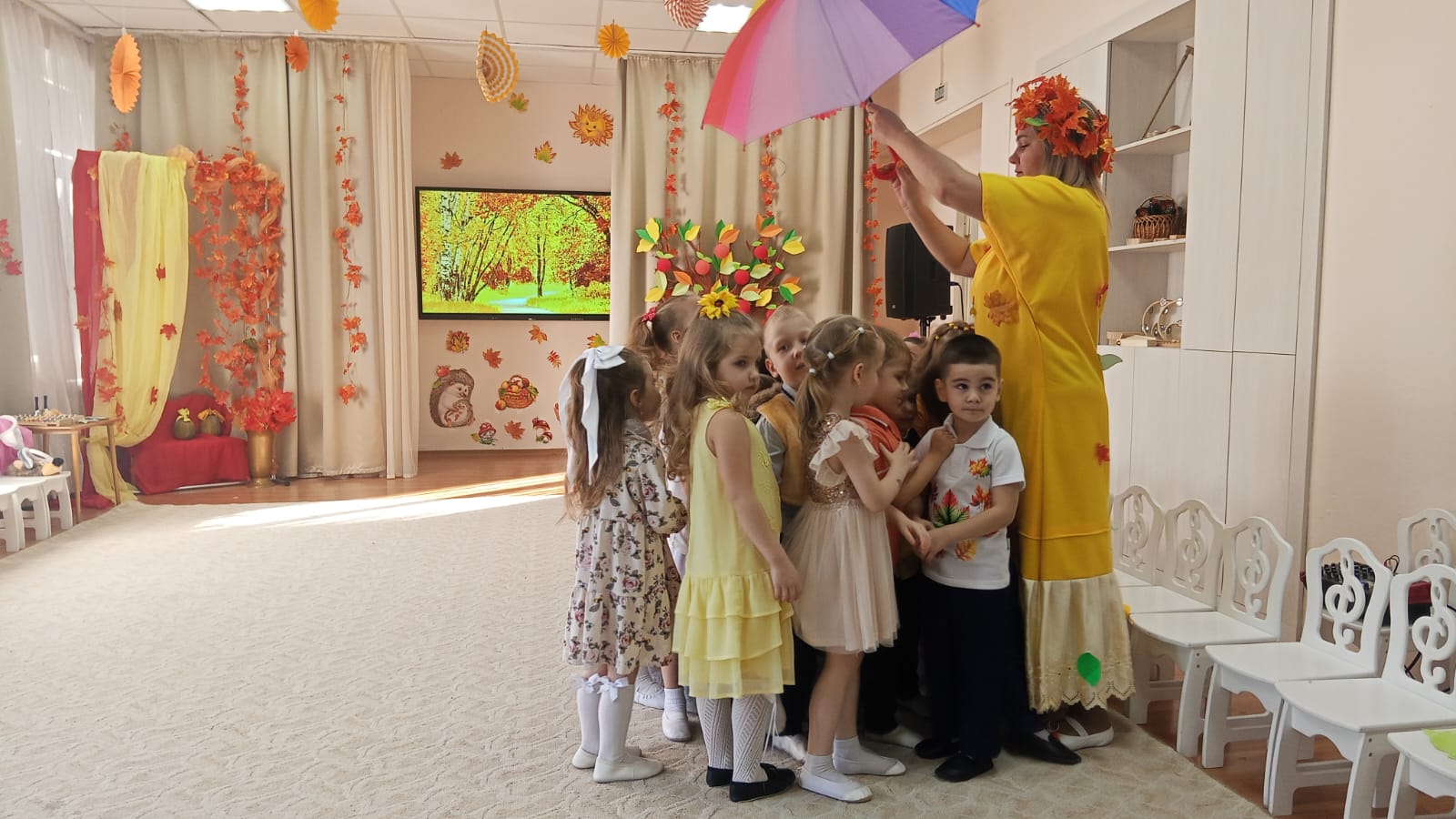 В средней группе состоялся замечательный праздник, посвящённый осени! «В гостях у Осени». Для ребят это запоминающийся, радостный и яркий праздник, который помогает им закрепить представления об осени как времени года. Осень даёт ребятам возможность радоваться ярким разноцветным листьям, опавшим с деревьев. Вот почему праздник осени в детском саду является одним из самых любимых у нашей детворы!