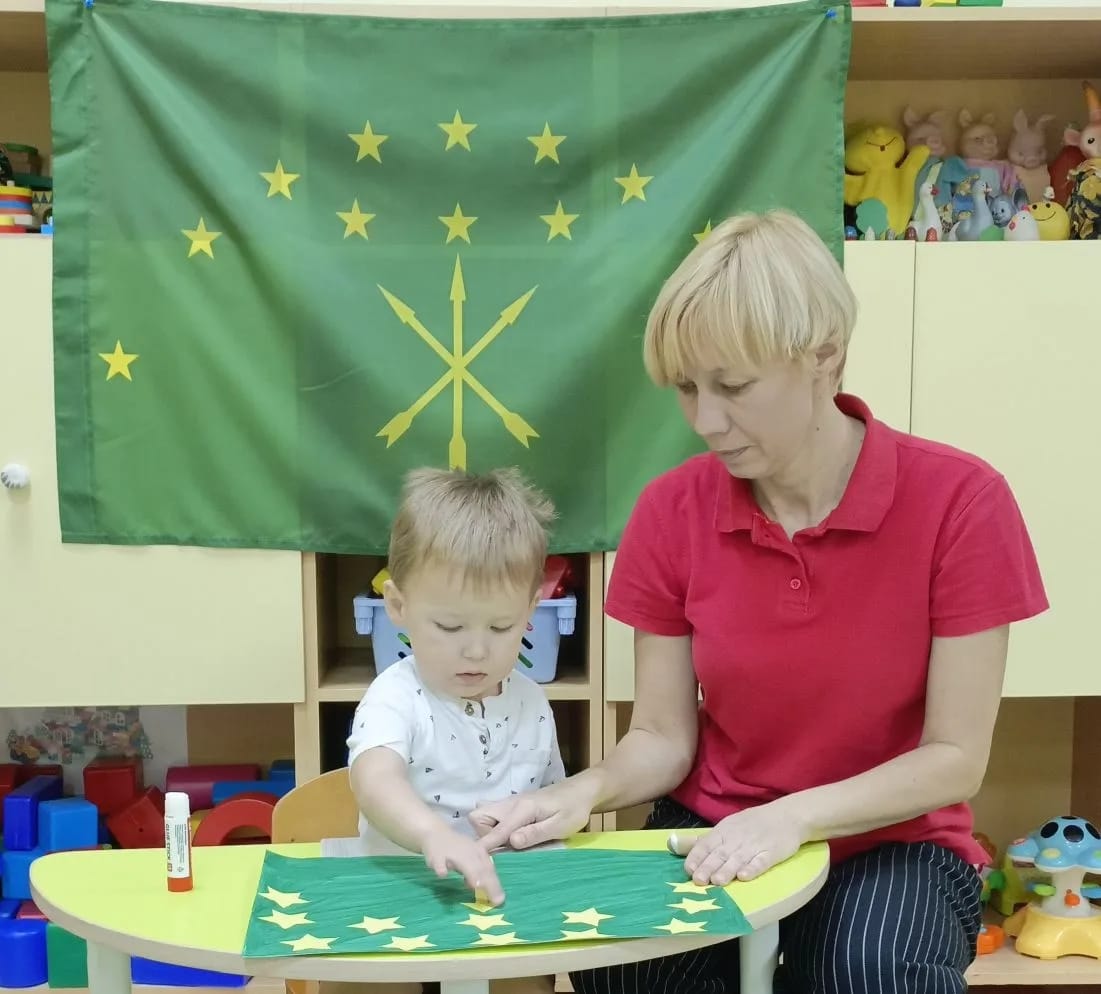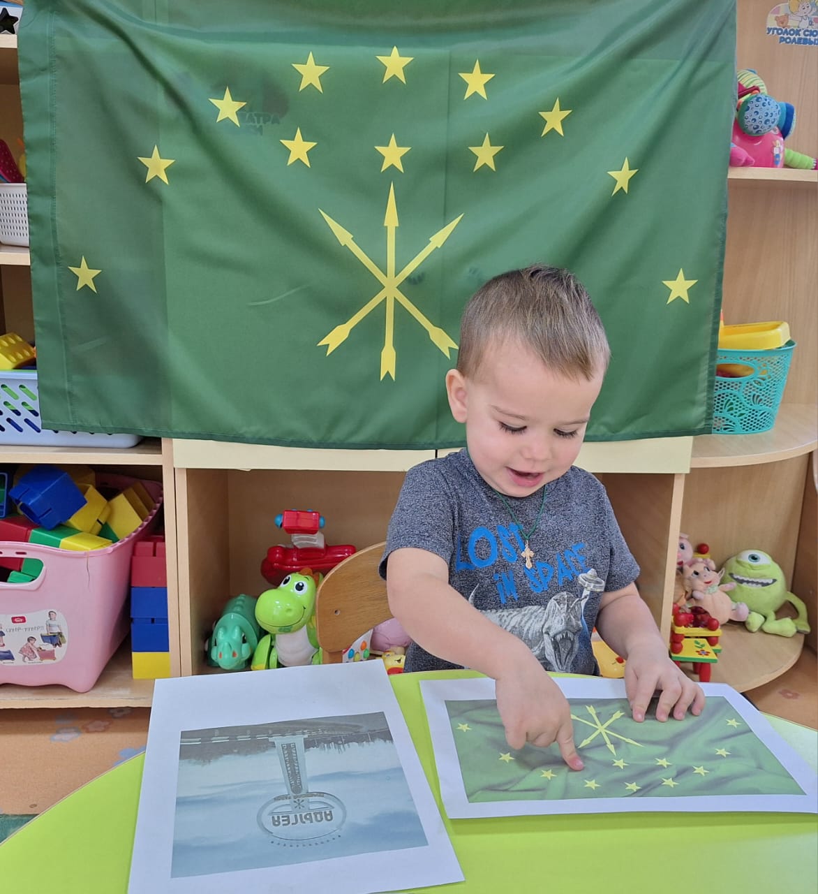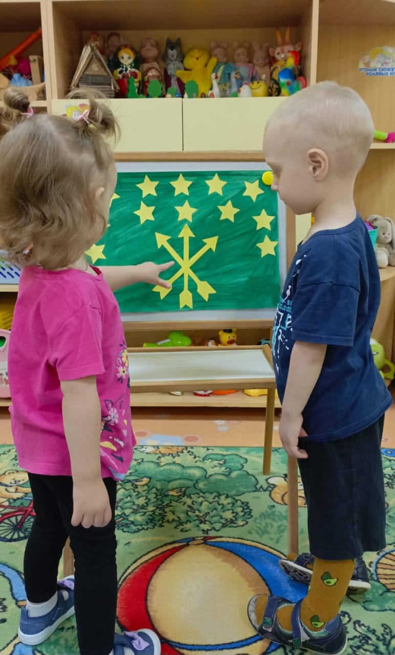 В рамках фестиваля культур народов Дона "Дружбой все едины "в группе раннего возраста прошёл тематический день "Флаг Республики Адыгеи". Ребята, совместно с педагогами Певневой Е. В. и Шматковой М. В., с большим интересом познакомились с особенностями флага данной республики,рассмотрели иллюстрации.